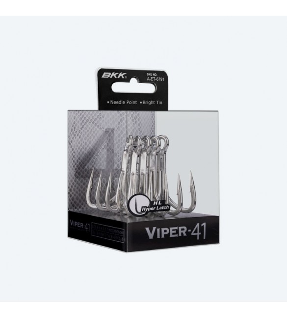 Il Viper-41 è rivestito in Bright Tin per resistere anche agli ambienti di acqua salata ed è disponibile in un'ampia gamma di dimensioni (da 6 a 6/0) per adattarsi a una vasta gamma di esche, da piccole vibrazioni a grandi stickbait e popper SW.