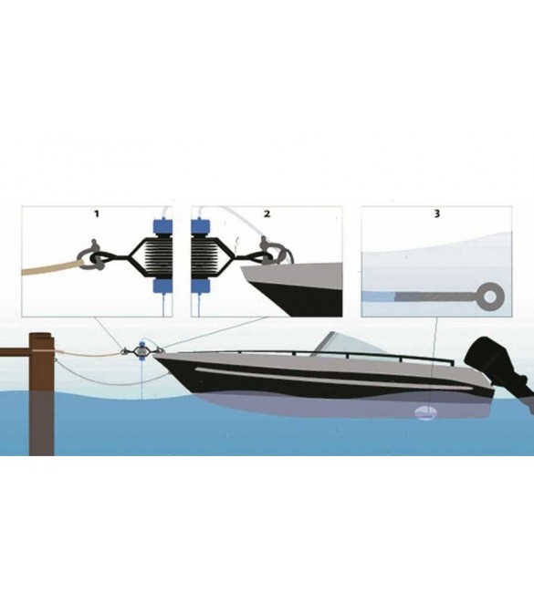 Ammortizzatore d'ormeggio con pompa di sentina Drainman che si attiva con la forza naturale delle onde e del vento tramite la tensione che si genera nella fune di ormeggio.