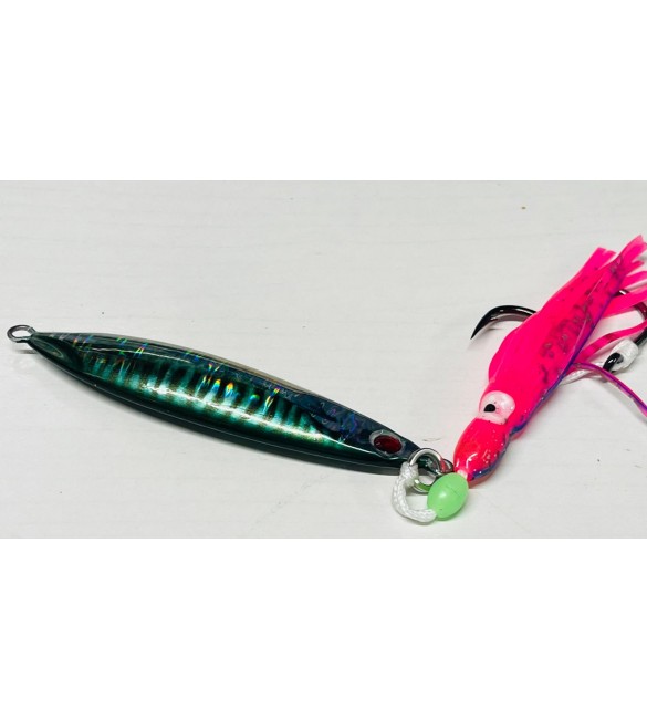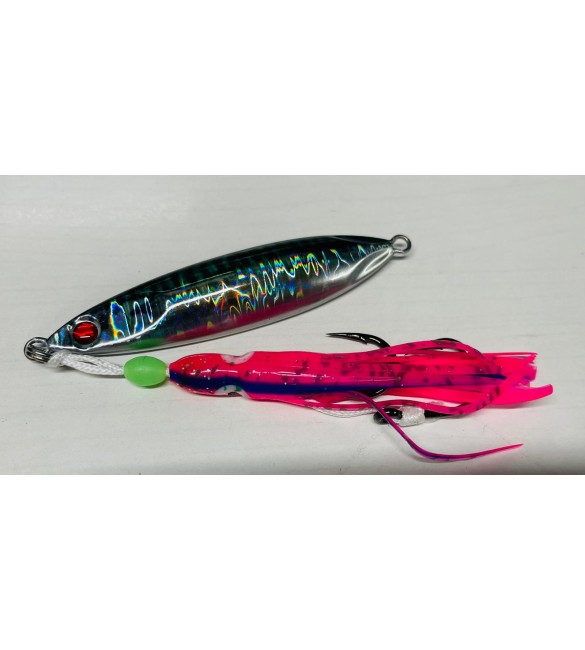 L’effetto cromatico luccicante del jig in metallo A RIGHE GLOW si unisce al movimento sinuoso del polipo in plastica diventando irresistibile per molte specie di pesci che fino a pochi anni fa si catturavano solo con esche naturali.