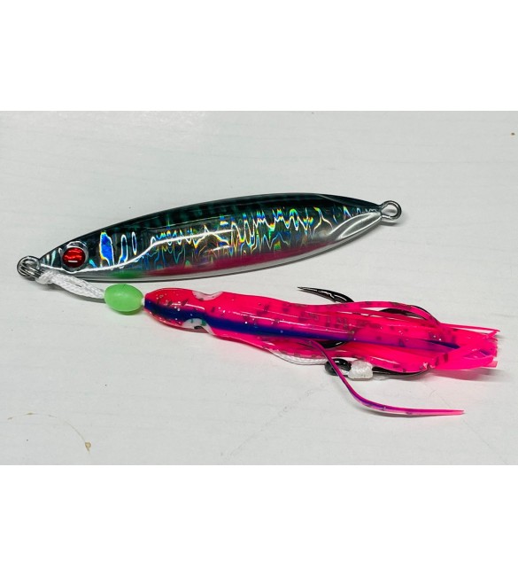 L’effetto cromatico luccicante del jig in metallo A RIGHE GLOW si unisce al movimento sinuoso del polipo in plastica diventando irresistibile per molte specie di pesci che fino a pochi anni fa si catturavano solo con esche naturali.