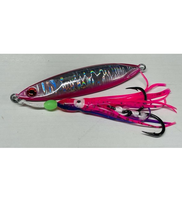 L’effetto cromatico luccicante del jig in metallo A RIGHE GLOW si unisce al movimento sinuoso del polipo in plastica diventando irresistibile per molte specie di pesci che fino a pochi anni fa si catturavano solo con esche naturali.