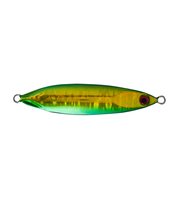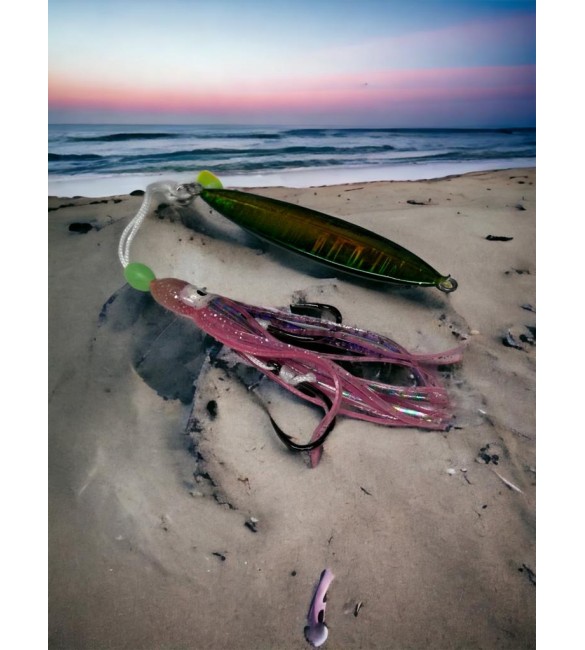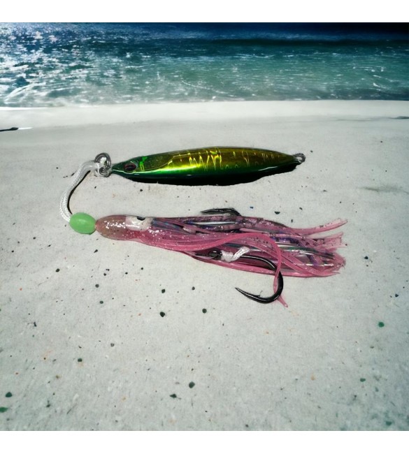 L’effetto cromatico luccicante del jig in metallo A RIGHE GLOW si unisce al movimento sinuoso del polipo in plastica diventando irresistibile per molte specie di pesci che fino a pochi anni fa si catturavano solo con esche naturali.