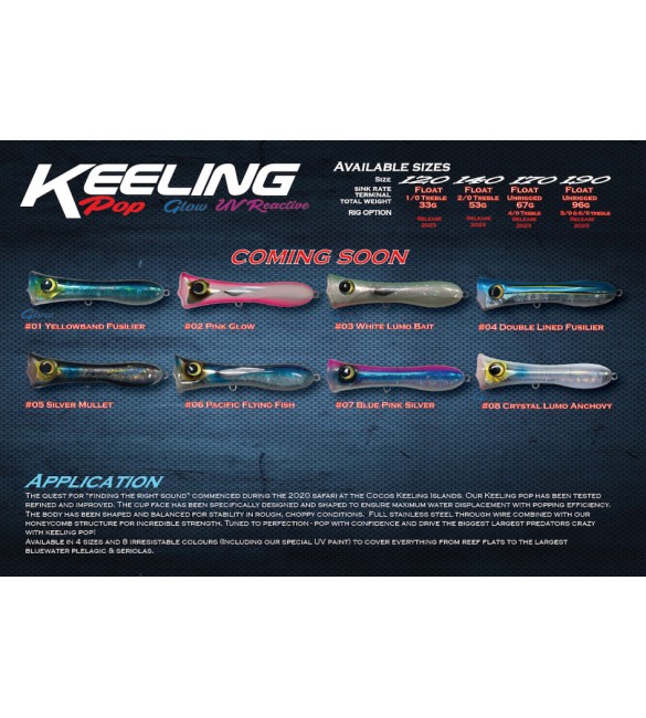 Il Keeling Pop è disponibile in 4 misure e 8 irresistibili colori, inclusa la nostra speciale vernice UV per coprire tutto, dalle secche della barriera corallina ai più grandi pelagici e seriole di acque blu.