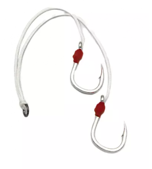 1 doppio montaggio di ami in carbonio BKK 2/0 3X (HIGH CARBON) , giunti ricoperti in termoretraibile, treccia rinforzata da 1,2mm e anello saldato in acciaio inox.