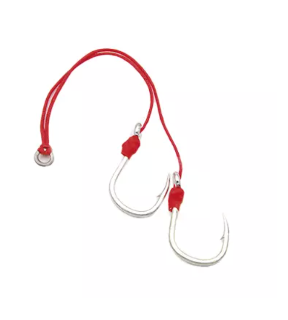 1 set doppio di ami BKK 1/0 3X in carbonio (HIGH CARBON), giunti ricoperti in termoretraibile, treccia rinforzata da 1 mm e anello saldato in acciaio inox.