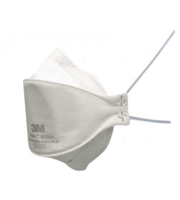 Mascherina 3M Aura 9300+ Comfort per polveri sottili, olii e nebbie provvista di filtrante Electret con speciale desing a tre strati per una migliore adattabilità e facilità nel parlare e con strato interno in tessuto per un maggiore comfort.