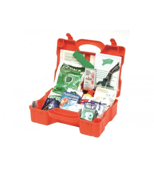 Valigetta pronto soccorso in contenitore con manico, chiusura a clip e kit di fissaggio a parete.