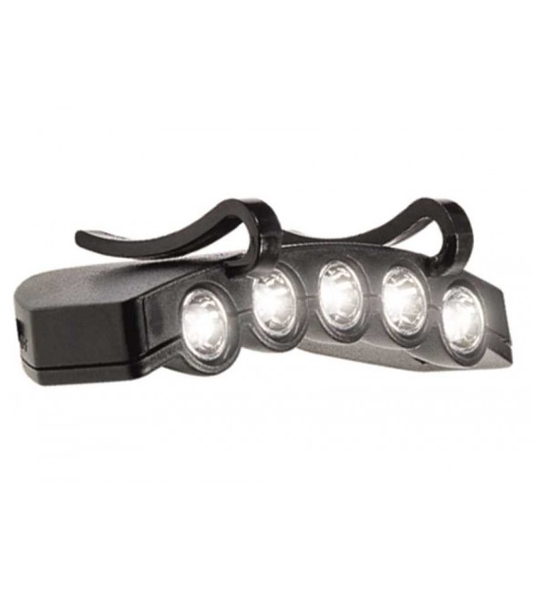 Pratica e leggera torcia frontale a LED con fermaglio per fissaggio alla visiera del berretto.