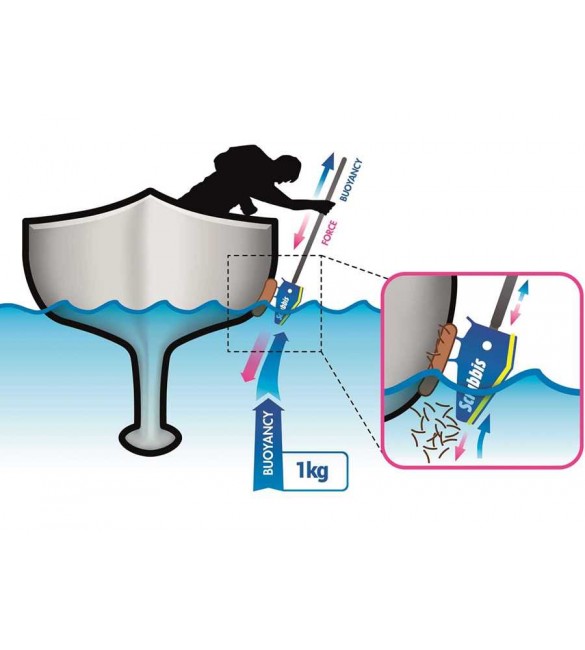 Sfrutta la spinta di galleggiamento (1 Kg) della spazzola per fare pressione con i raschietti e con la spugna sulle murate.