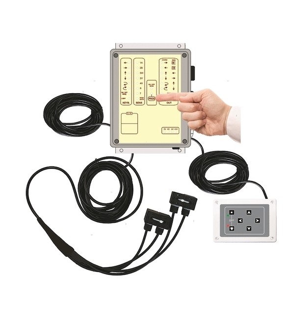 Si aziona con radiocomando e centralina elettronica a 10 canali cablata oppure con pannello comando a parete 127 x 87 mm completo di 10 metri di cavo.