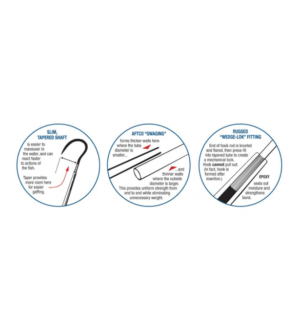 Con alberi di diametro di testa di 3/4 e 1 pollice, i Gaff Taper-Tip sono disponibili in lunghezze complessive di 3,4,5,6 e 8 piedi.