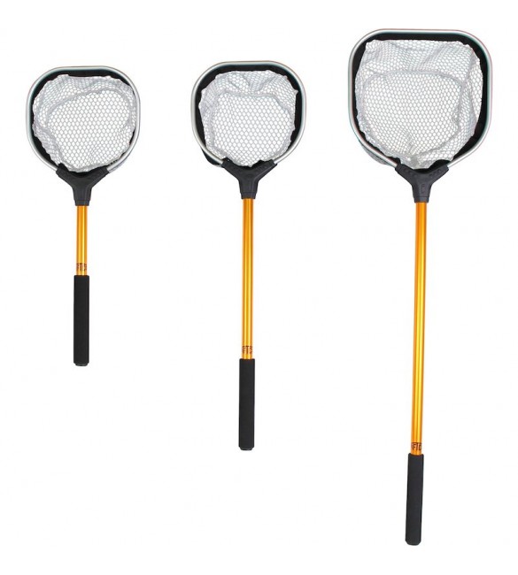 AFTCO Bait Nets è dotato di maniglie in alluminio anodizzato oro con impugnature in vinile nero e sono disponibili in lunghezze di 12, 18 e 24 pollici.