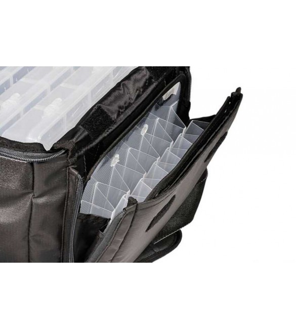 Borsa con tre grandi scatole porta esche e accessori, visibili attraverso il coperchio trasparente, una tasca frontale con celle per hard lures, una tasca laterale e l’alloggiamento per la pinza.