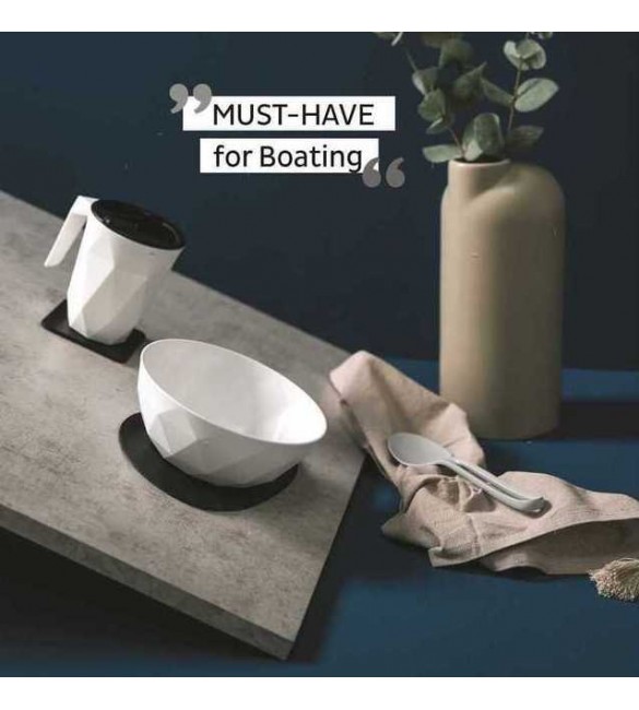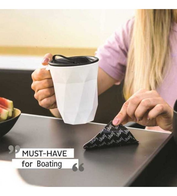 Dotata di coperchio con tappo, magnete integrato sul fondo e sottobicchiere metallico in nano-gel rimovibile, che non lascia residui e aderisce a tutte le superfici.