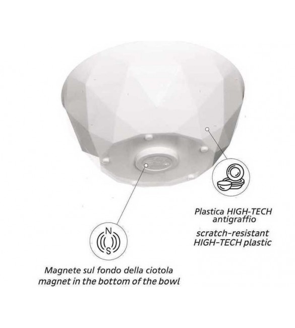 Set di due ciotole e due piatti in plastica infrangibile Hightech con magnete integrato sul fondo per una perfetta adesione al tappetino metallico o al vassoio della linea Silwy.