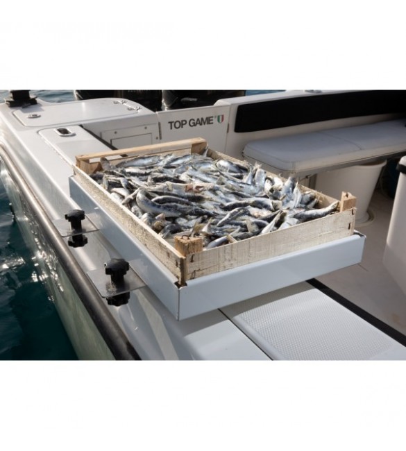 La cassetta portaesche solidale con gli apparecchi, permette una comoda tagliatura e posizionamento delle esche nei carousel dei pasturatori senza lasciare in barca nessun segno di sporcizia e sangue.