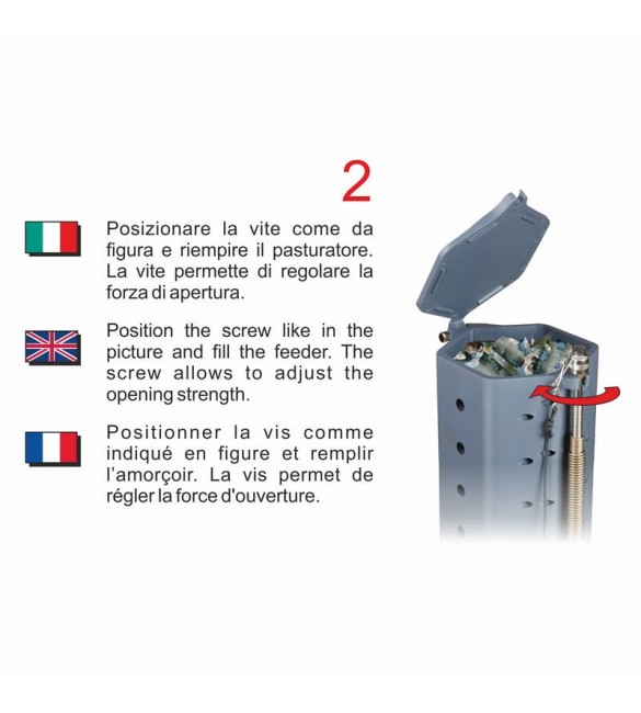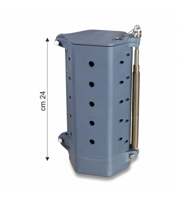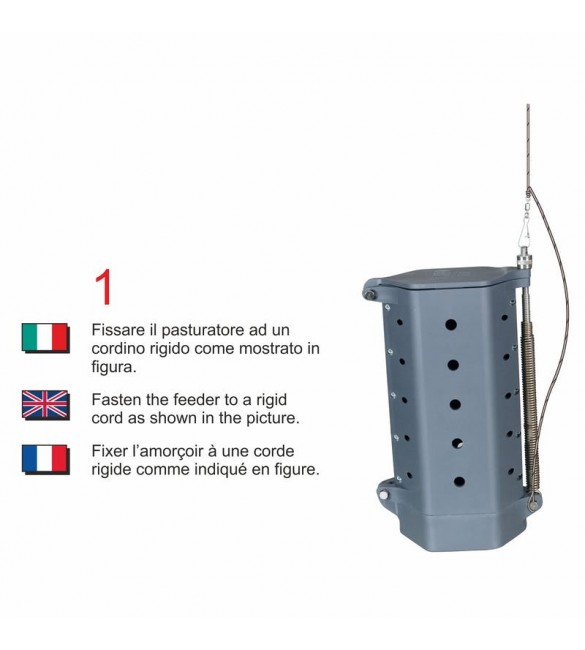 Funzionamento: riempire il pasturatore, bloccare il coperchio e calarlo dalla barca con un cordino rigido alla profondità desiderata.